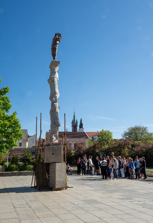 Často používá klasické materiály a formuje je do srozumitelných vztahů, proporcí a příběhů, které pronikají racionální strukturou konkrétního místa. Nejinak je tomu i u sousoší, které vzniklo přímo pro Náměstí Přemysla Otakara II a které citlivě pracuje nejen s jeho pamětí. 6, 5 m vysoký sloup figurálního tvarosloví je podepřen třemi různými kameny. Neliší se jen velikostí a materiálem, ale také svoji historií. Pískovcový je původním soklem pod sochu, přičemž žulový pochází z pomníku Jana Švermy – předválečného novináře a politika, jehož autorem je sochař Antonín Nykl. Původně byl v letech 1969 – 1999 umístěn na předmostí Švermova – dnes Štefánikova mostu v Praze a v roce 2004 byl přestěhován na Olšanské hřbitovy v Praze. Další pochází z pomníku Antonína Zápotockého – druhého komunistického prezidenta Československa, od sochaře Jana Hány a architekta Josefa Poláka a stával právě zde. Po roce 1989 byla bronzová socha odstraněna, převezena do galerie na Klenovou a tam demonstrativně zakopána. Sokl pak dlouho zůstal uprostřed prostranství a jeden čas galerie dokonce uvažovala o tom, využít ho pro dočasné výstavy soch – volně inspirována podobnou akcí pro prázdný sokl na Trafalgar Square v Londýně. Někdy kolem roku 2006 byl ale i ten převezen na Klenovou.